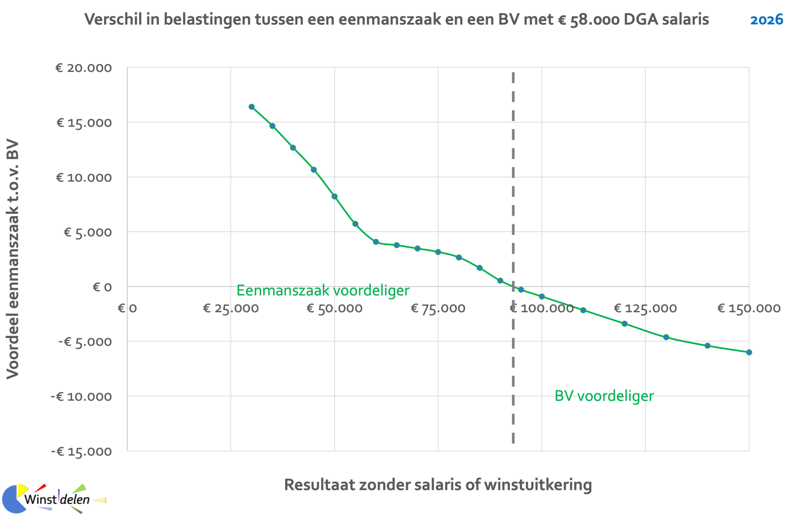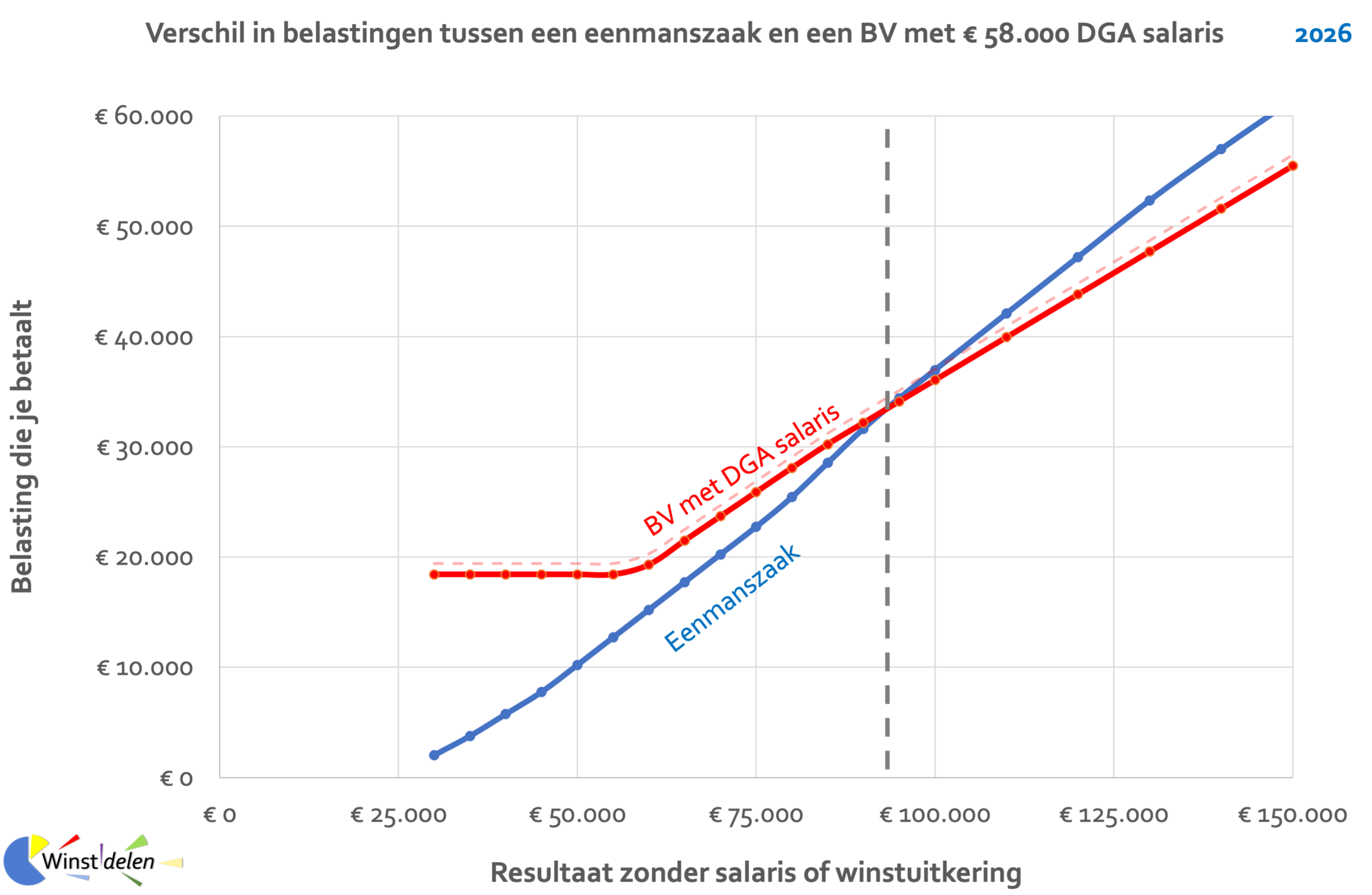 Dit is grofweg vanaf een bedrijfsresultaat (voor winstuitkering of salaris) van € 93.000, maar dat hangt wel sterk af van het DGA salaris dat gebruikelijk is. Als dit hoger ligt dan de standaard van € 58.000, blijft een eenmanszaak langer de voorkeur hebben.