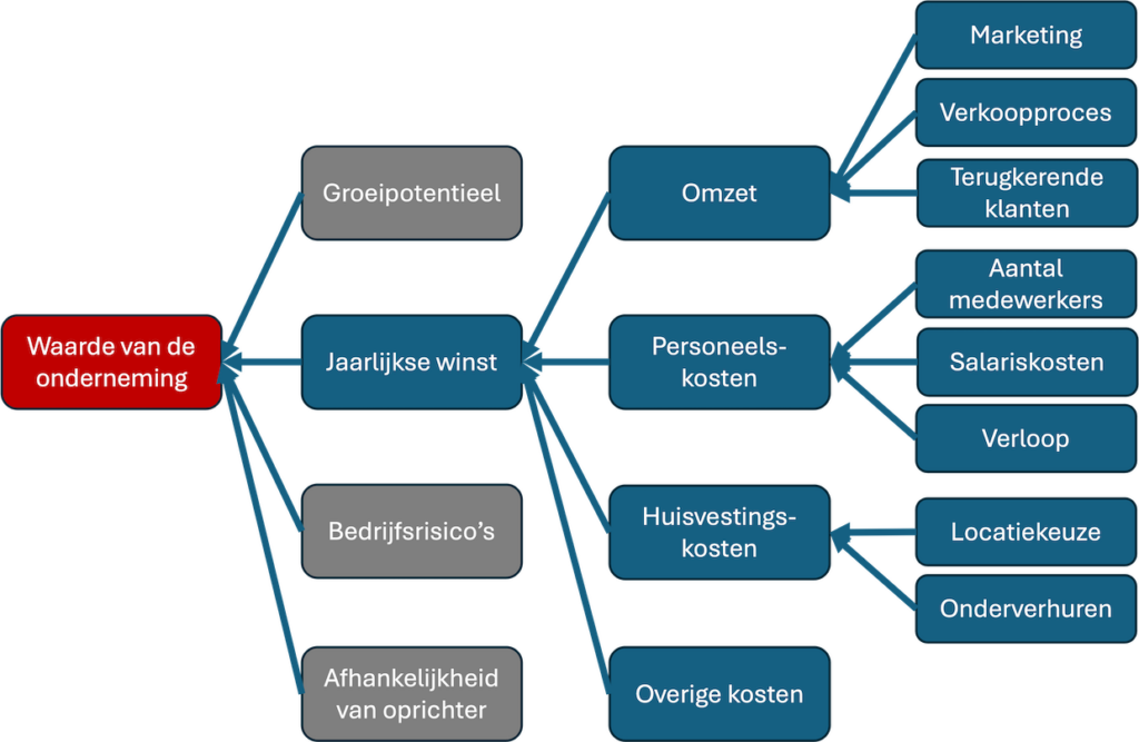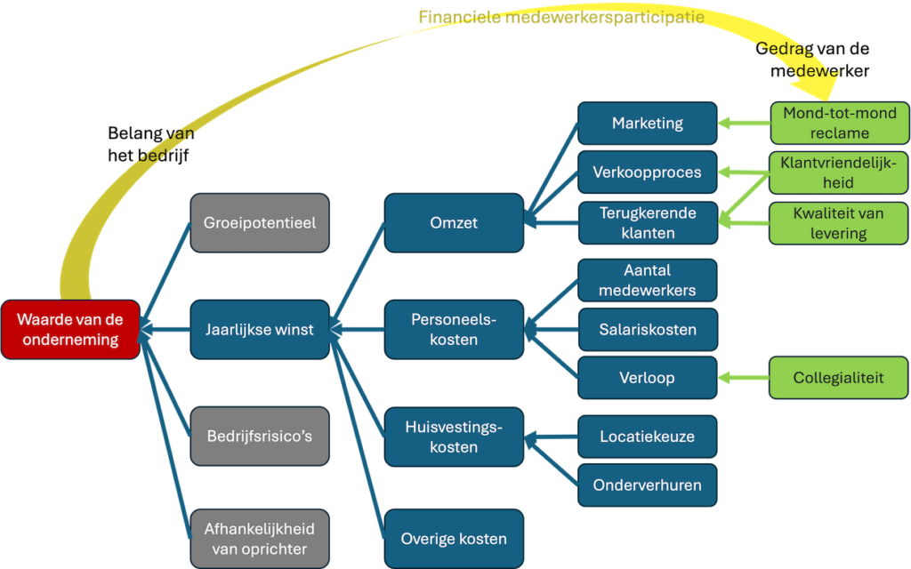 Belangrijk is dat medewerkers de waardeboom, die jij al wat hebt aangepast en uitgebreid, herkennen. Hoe je de jaarlijkse winst vertaalt naar een waarde van de onderneming is vaak wat complexer, dat leggen wij soms zelf uit. Maar jij als ondernemer moet zelf kunnen aangeven welke factoren van belang zijn voor de jaarlijkse winst.